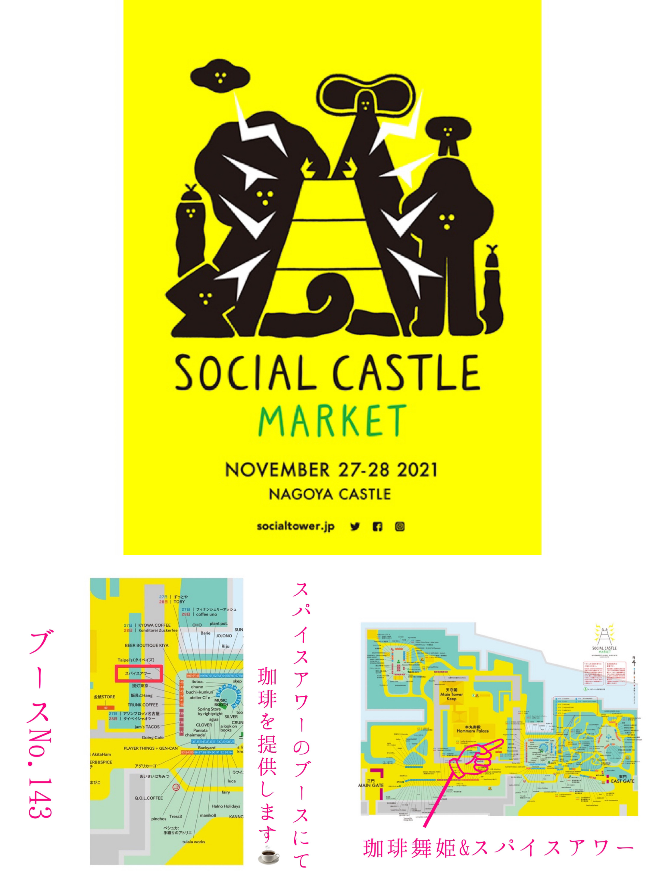 SOCIAL CASTLE MARKET に出店します☕️ 珈琲を取り扱って頂いている、スパイスアワーのブースにお邪魔します🍛☕️ (※フライヤーには珈琲舞姫の名前はございません🙏) 大好きなスパイスアワーの2人と一緒にブースにてお待ちしております☺️ 凡ちゃんメニューの「自家製凡コーラ」「自家製凡チャイ」もしっかり仕込んでいきます。 当日にお豆の購入をご希望の方は、事前にご予約をお願いいたします。 お気軽にDM送って下さい💌 - 【 開催日 】 2021年11月27日(土) / 11月28日(日) 【時間】 10:00~16:30 【場所】 名古屋城 【ブースNo.】 143 -
