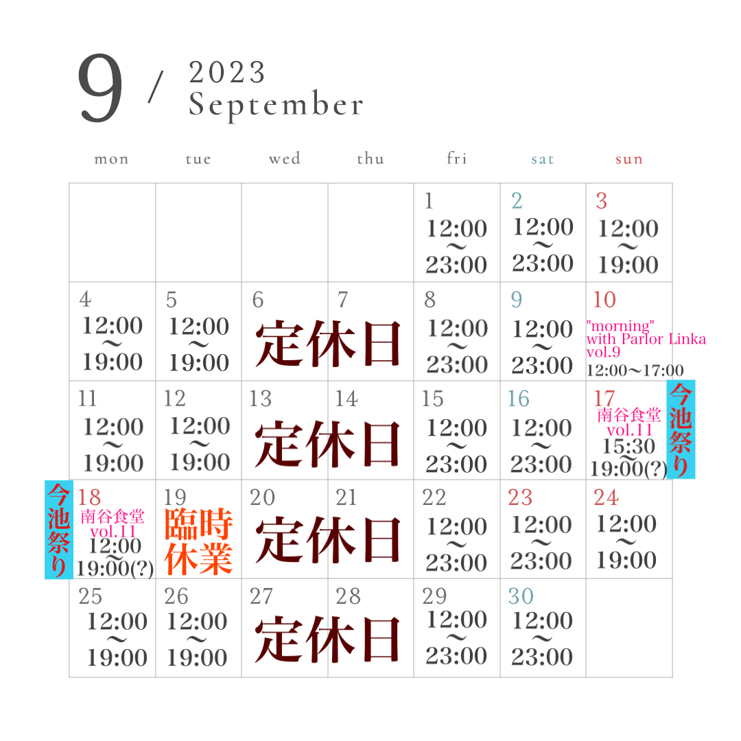 - - 𝖲𝖾𝗉𝗍𝖾𝗆𝖻𝖾𝗋🍂 大好きな𝟫月が始まります.ᐟ.ᐟ 𝟫月は今池祭りがあるから大好き。 どこのお祭りよりも好き。 今年の今池祭りはみんな大好き南谷ちゃんを呼んで𝟤𝖽𝖺𝗒𝗌祭り仕様でお店開けます! 南谷ちゃんのおつまみも楽しみ!🏮 珈琲はもちろんお酒もたっぷり用意してお待ちしております! テイクアウトももちろん可能です! 𝟫月とは言えど毎年まだまだ暑いです。 お祭りの休憩所、酒場、喫茶としてご利用頂ければと思います! 去年はお店に籠りっきりで参加できなかったので、今年は初日の序盤だけ街に繰り出します.ᐟ.ᐟ 今月も宜しくお願い致します!駆け抜けます🏃♀️💨 - 𝟣𝟢(日) 𝟪:𝟢𝟢-𝟣𝟩:𝟢𝟢 "𝗆𝗈𝗋𝗇𝗂𝗇𝗀" 𝗐𝗂𝗍𝗁 𝖯𝖺𝗋𝗅𝗈𝗋 𝖫𝗂𝗇𝗄𝖺 𝗏𝗈𝗅.𝟫 - 【今池祭り】 𝟣𝟩(日) 𝟣𝟧:𝟥𝟢-𝟣𝟫:𝟢𝟢(?) 南谷食堂 𝗏𝗈𝗅.𝟣𝟣 𝖽𝖺𝗒𝟣 𝟣𝟪(月) 𝟣𝟤:𝟢𝟢-𝟣𝟫:𝟢𝟢(?) 南谷食堂 𝗏𝗈𝗅.𝟣𝟣 𝖽𝖺𝗒𝟤 ※両日夜は店主が元気な限り、開けてます! 当日、𝖨𝗇𝗌𝗍𝖺𝗀𝗋𝖺𝗆にて都度お知らせします🙇 - 𝟣𝟫(火) 臨時休業 -